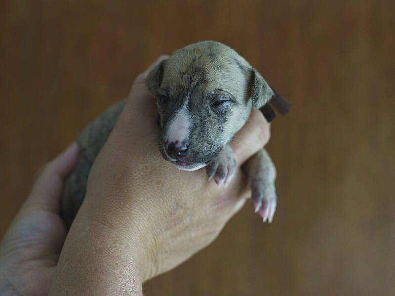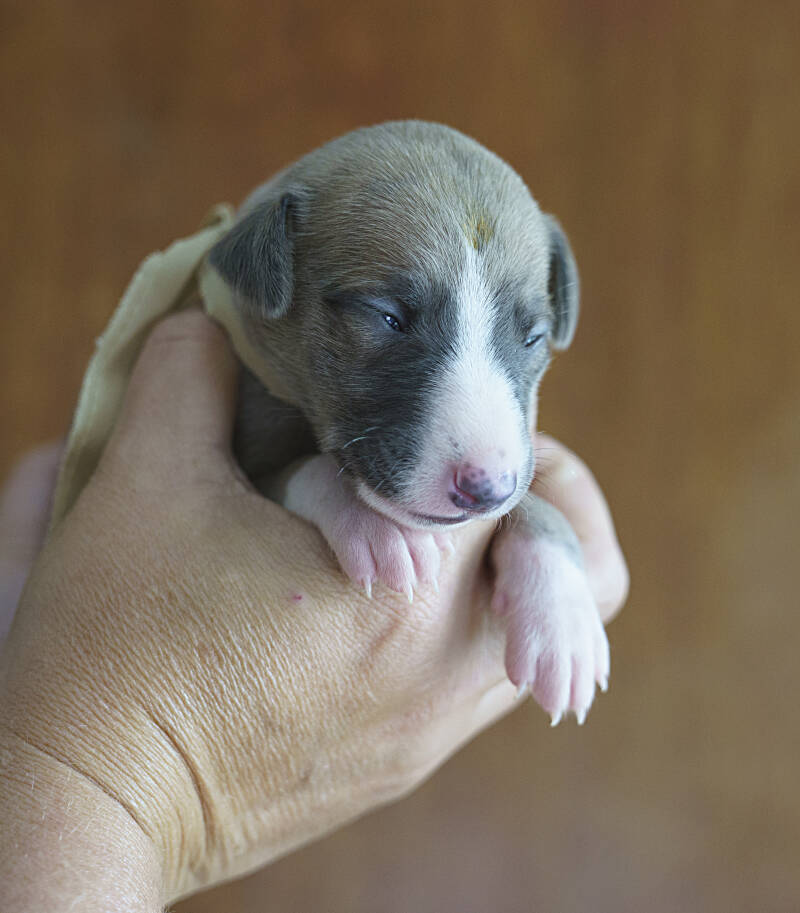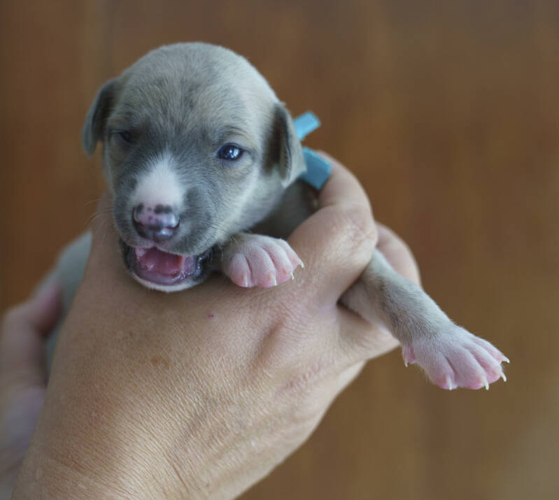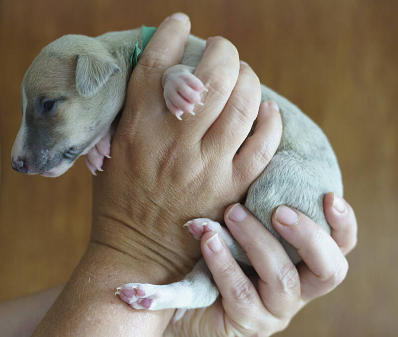 Pup Groen. Hij voor bij de geboorte gram en weegt nu gram.